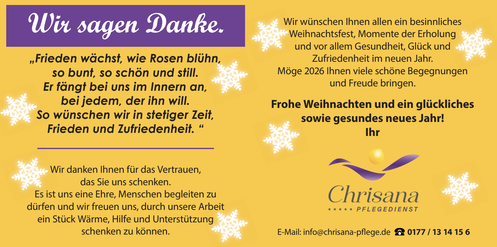 Sehr geehrte Damen und Herren, vielen Dank für die rasche Rückmeldung und das freundliche Gespräch. Wir haben uns für Chrisana entschieden und sind sehr zufrieden! Beste Grüße
